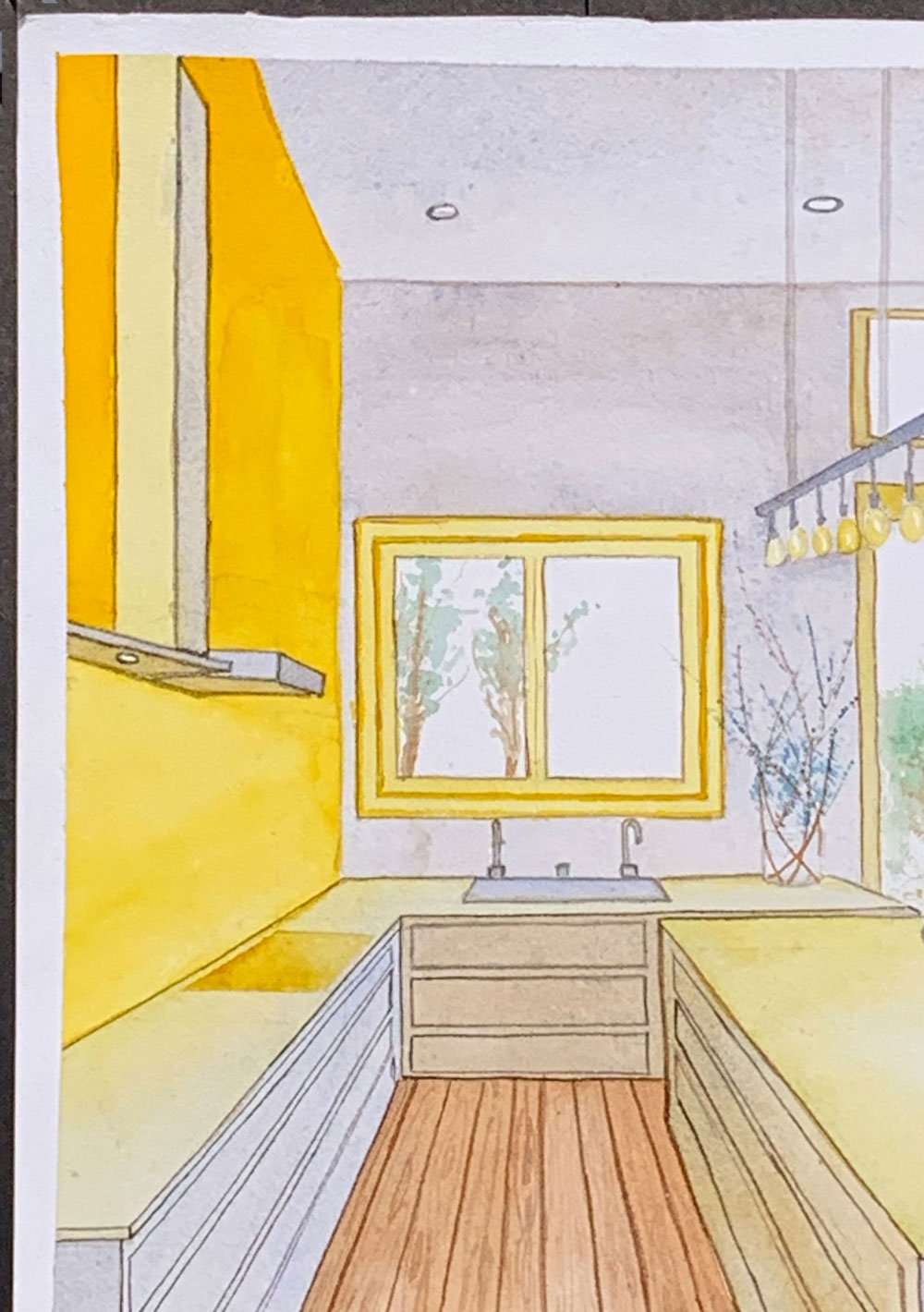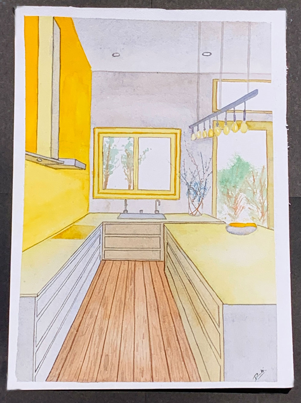 This design of kitchen interior was some what inspired by a painting I came across online. I have made changes in the color scheme and have used one point perspective to show the depth. Working with   watercolors can be tricky sometimes but I try to make it look as realistic as possible.