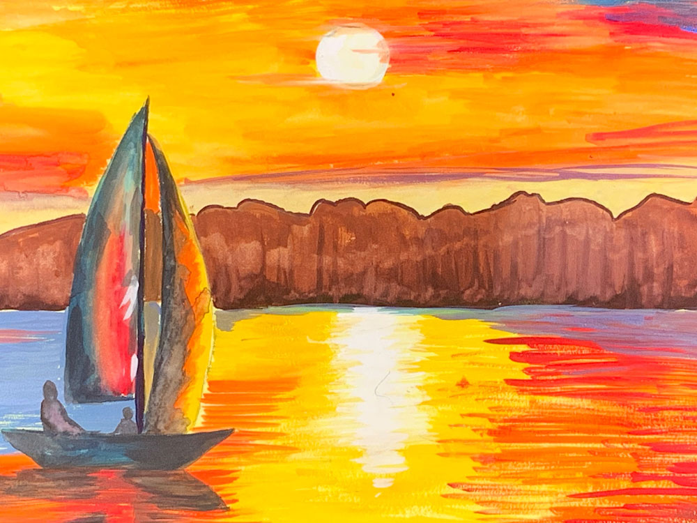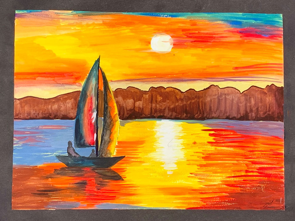This painting is a m mix of imagination and inspiration made using poster colors in a stroke-like painting method. the sunrise and the colors used to display its reflection in the water were completely imaginative where as the boat resembles a painting I saw in a magazine. I made sure to show the reflection of the boat in the water.