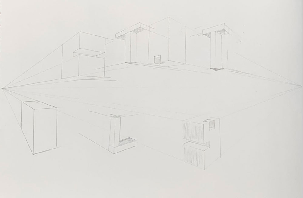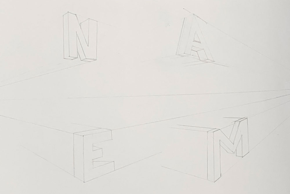 These are snippets from my sketchbook that show how I learnt the entire concept of two point perspective. I have practiced it with letters and with making hollow spaces , giving it the right perspective.